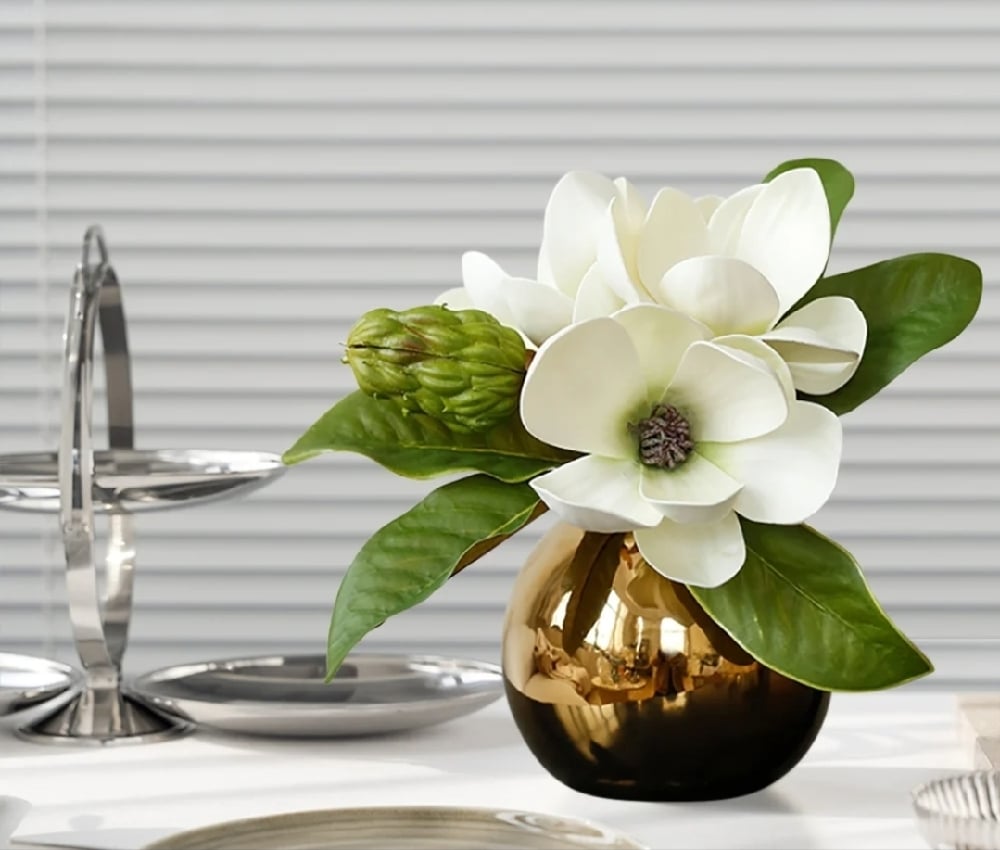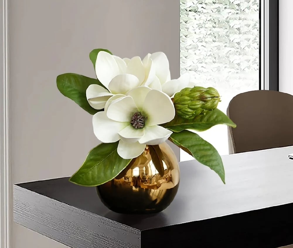 Chic any space with our Fashionable Faux Magnolia in Gold Glass Ball Vase Set. Any living room, bedroom, or office is executed with elegance thanks to this contemporary arrangement, featuring a lavish gold vase.